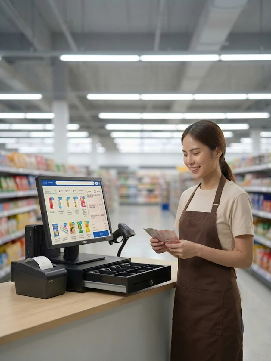 โปรแกรม POS สุดประหยัด สำหรับร้านค้าที่ขายปลีกอย่างเดียว เช่น มินิมาร์ท โชห่วย ร้านค้าชุมชน มีฟังก์ชั่นพื้นฐานของระบบแคชเชียร์ครบ เช่น รองรับการสแกนบาร์โค้ด สัมผัสจอ พิมพ์บิล คุมลิ้นชัก ระบบสมาชิก ติดหนี้ ออกใบกำกับภาษี เปิดปิดกะ ตัดสต็อกและจัดการสต็อก รายงานสต็อก รายงานยอดขาย สินค้าขายดี จัดการภาษีสินค้า