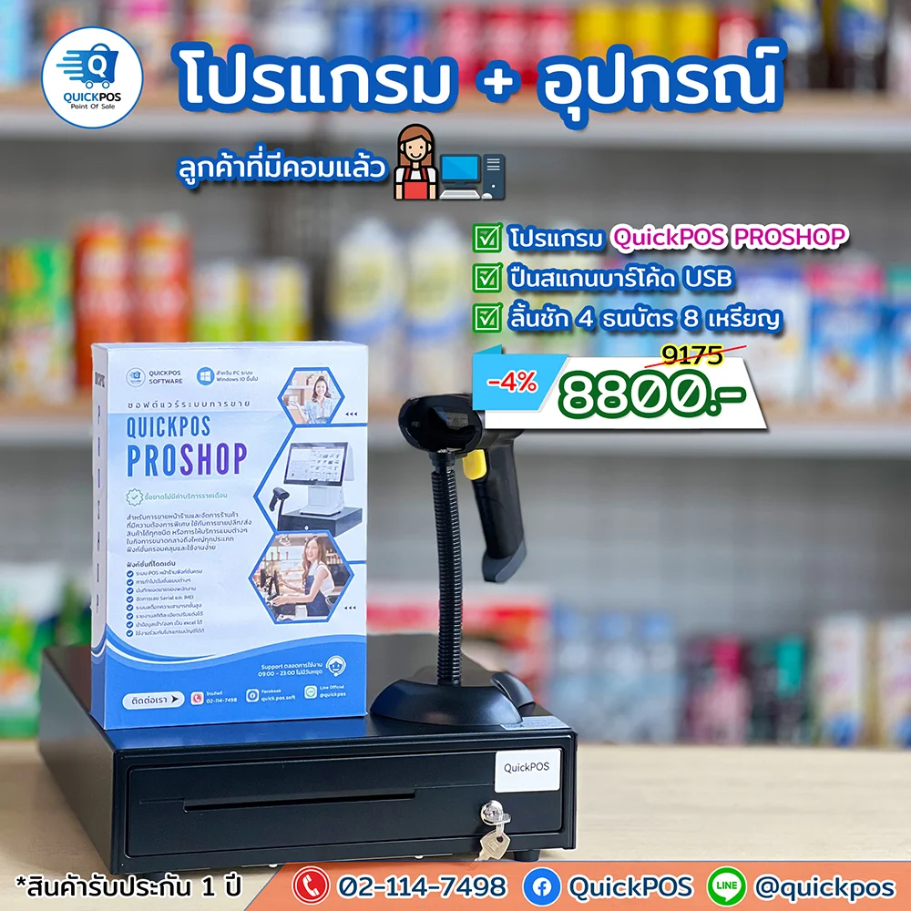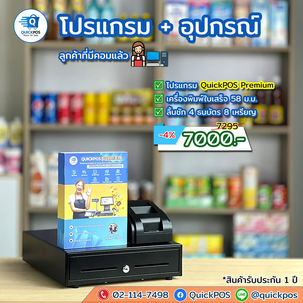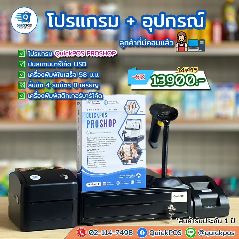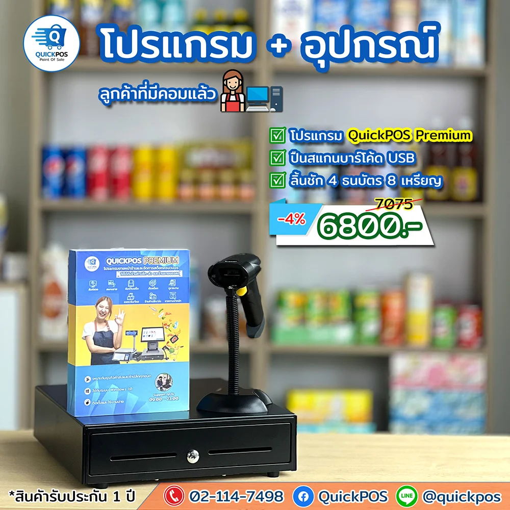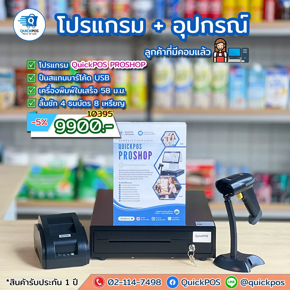 โปรแกรม + ปืน + พิมพ์ใบเสร็จ + ลิ้นชัก + พิมพ์บาร์โค้ด