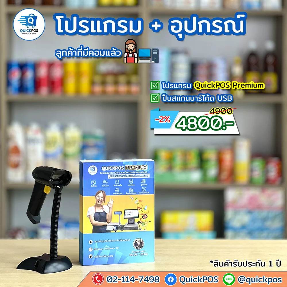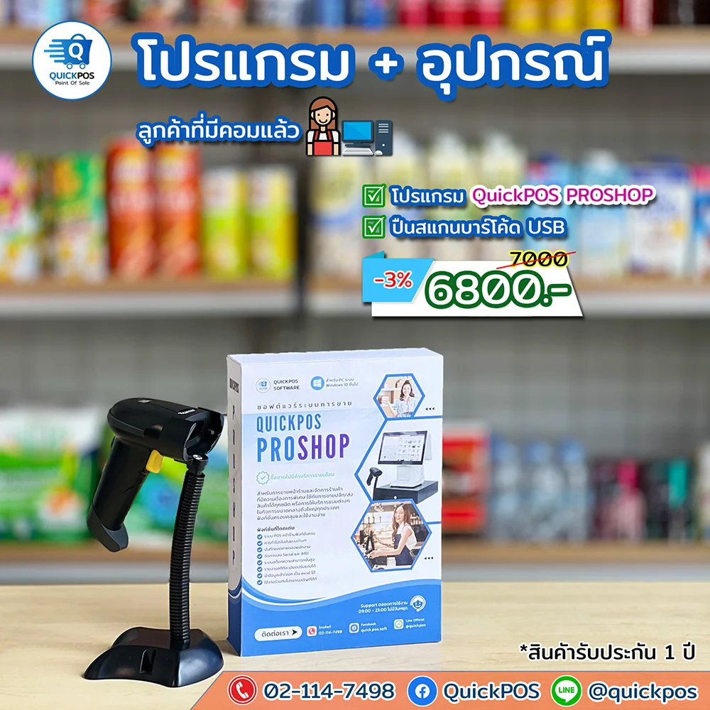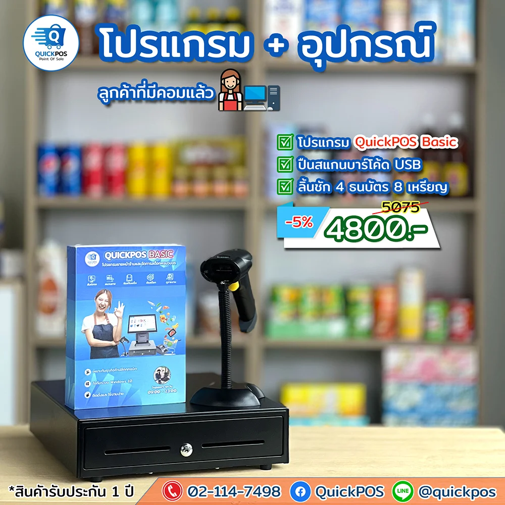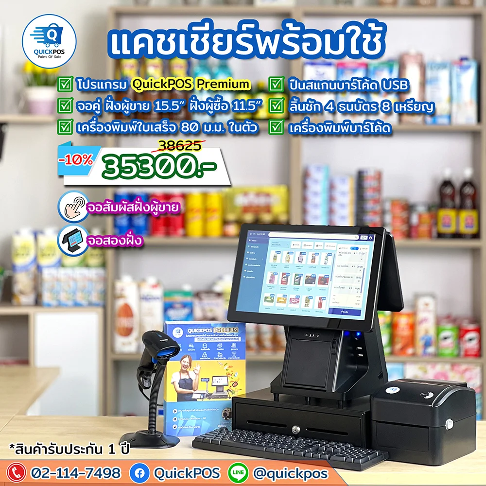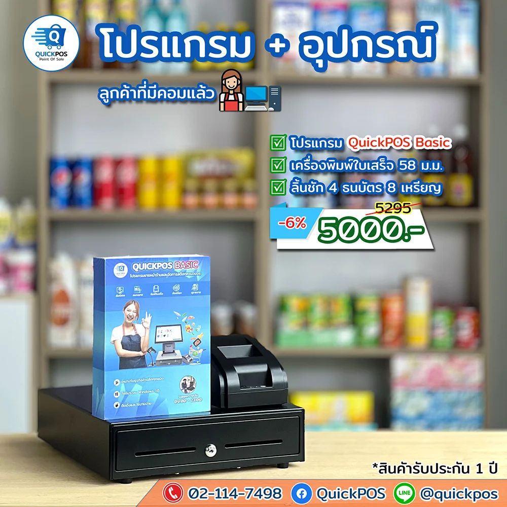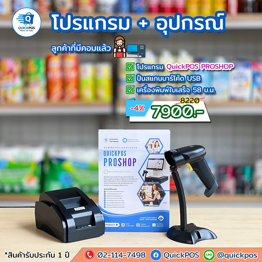 โปรแกรม + ปืน + พิมพ์ใบเสร็จ + ลิ้นชัก + พิมพ์บาร์โค้ด