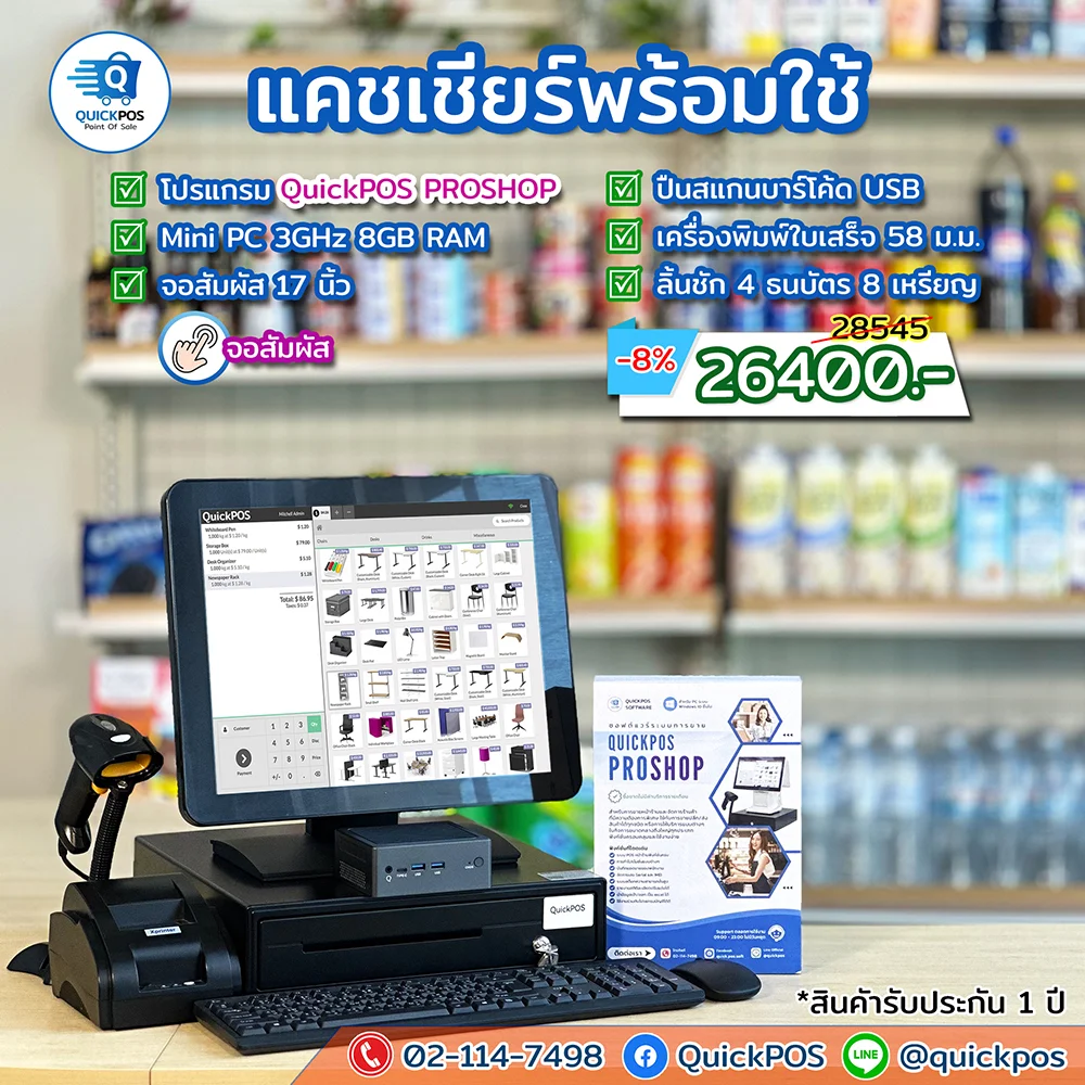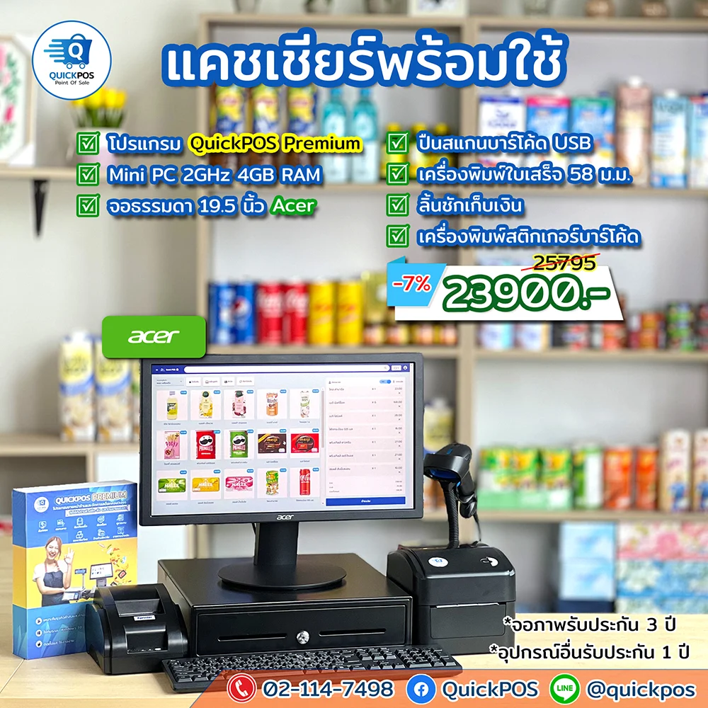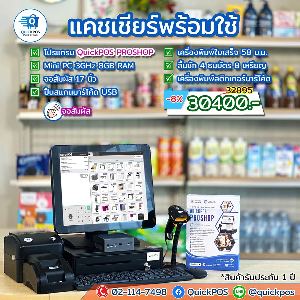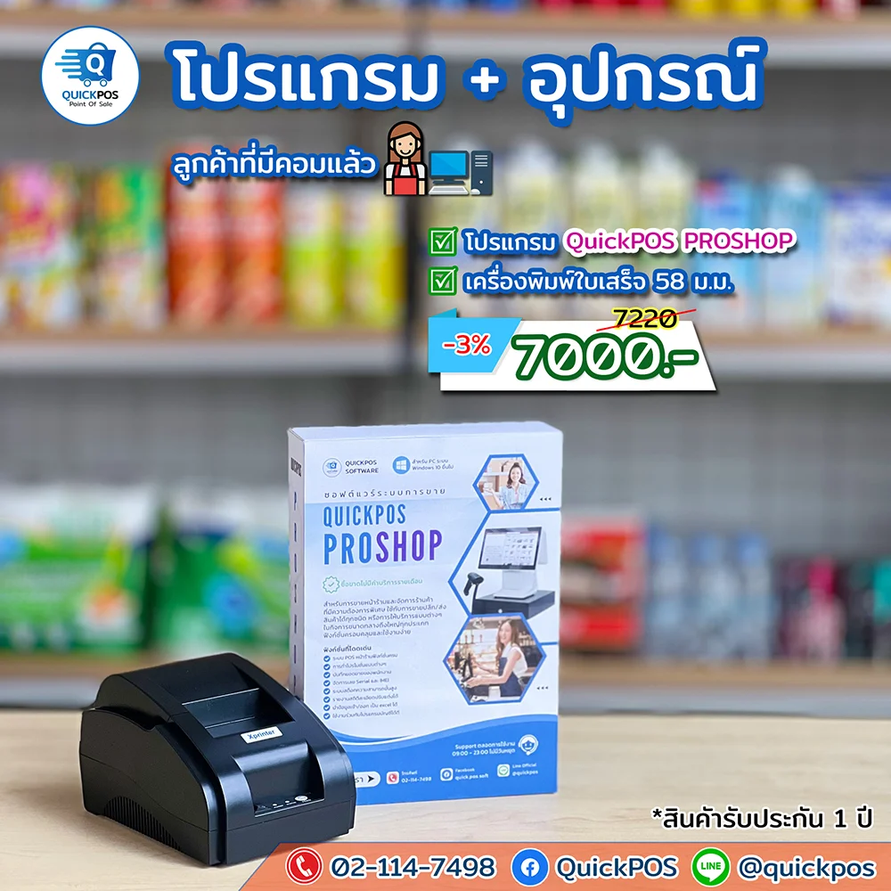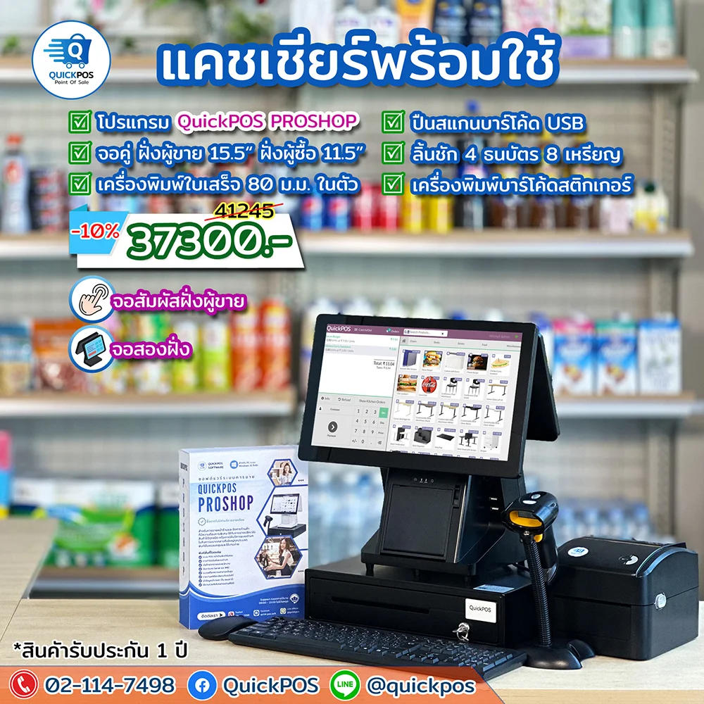 โปรแกรม + ปืน + พิมพ์ใบเสร็จ + ลิ้นชัก + พิมพ์บาร์โค้ด