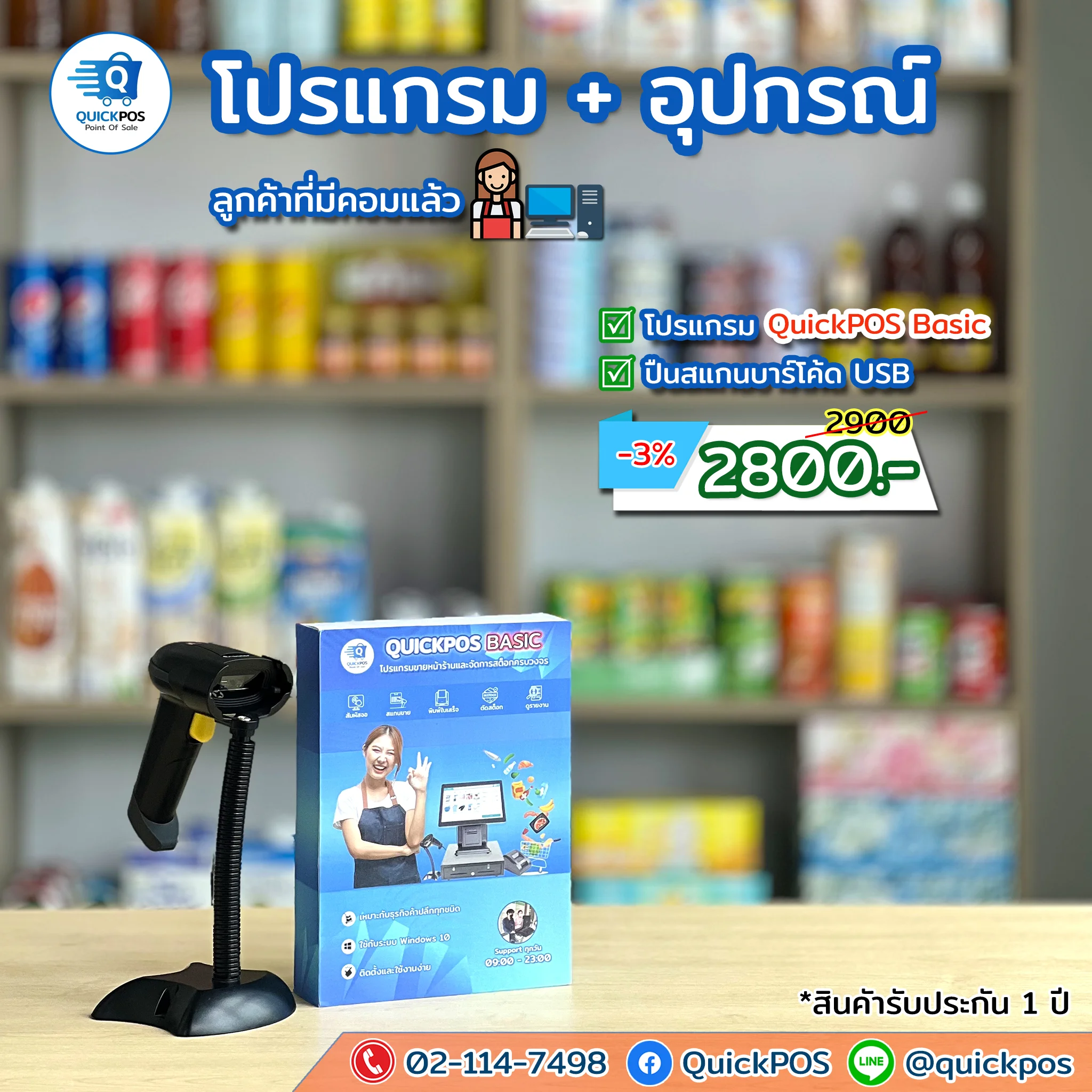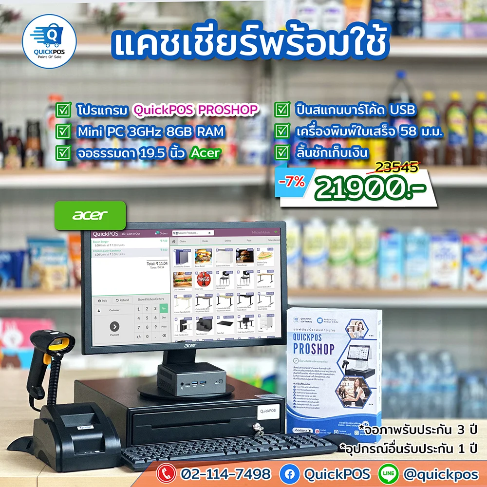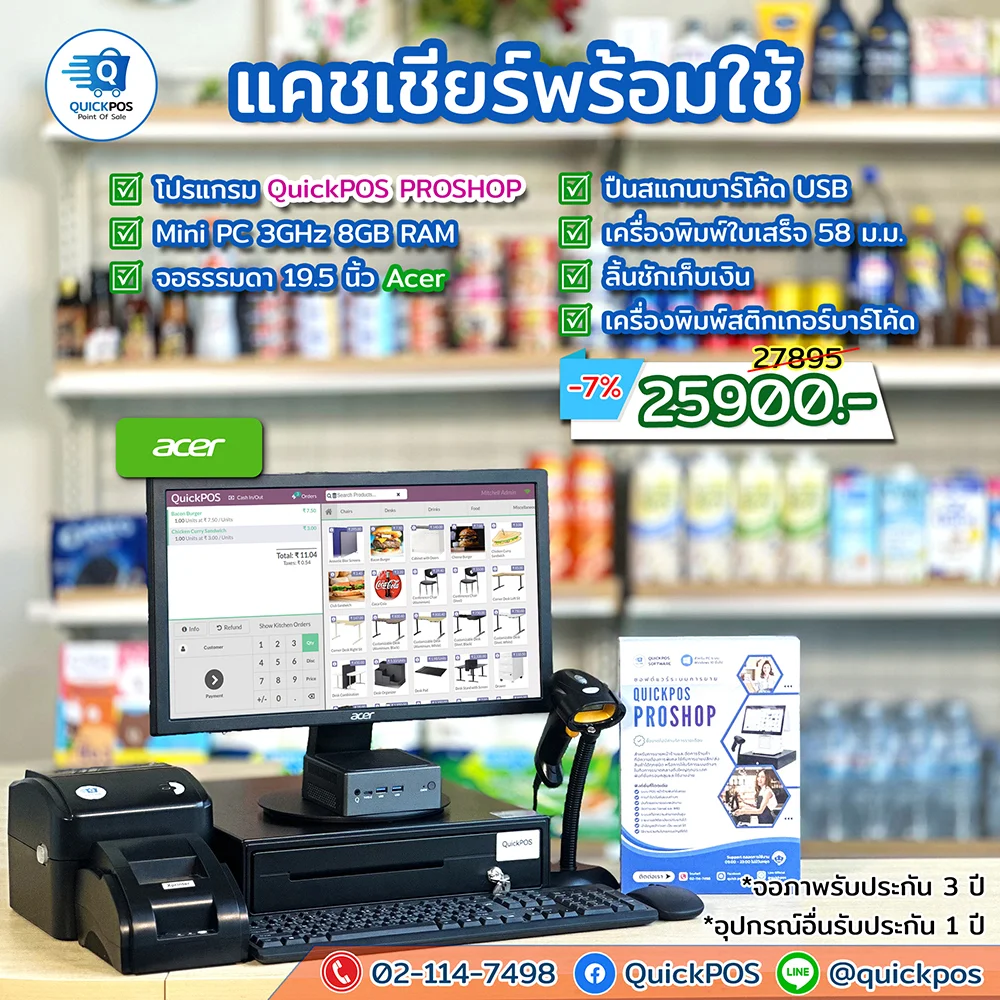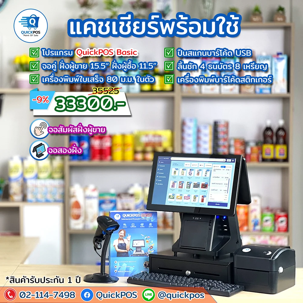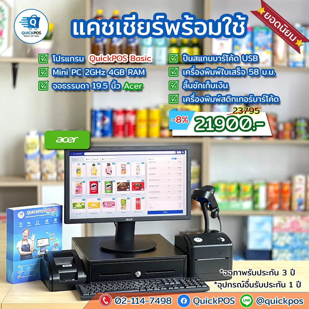 โปรแกรม + ปืน + พิมพ์ใบเสร็จ + ลิ้นชัก + พิมพ์บาร์โค้ด