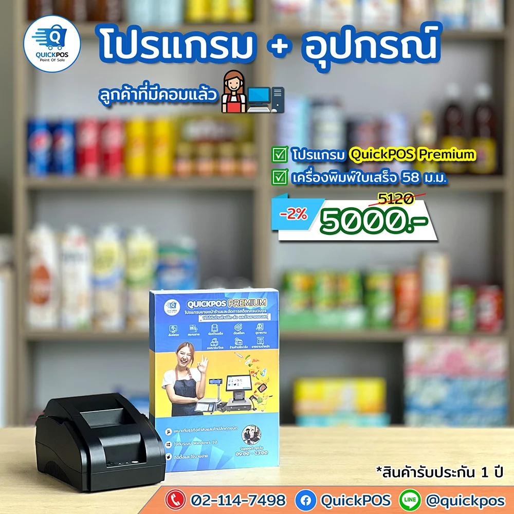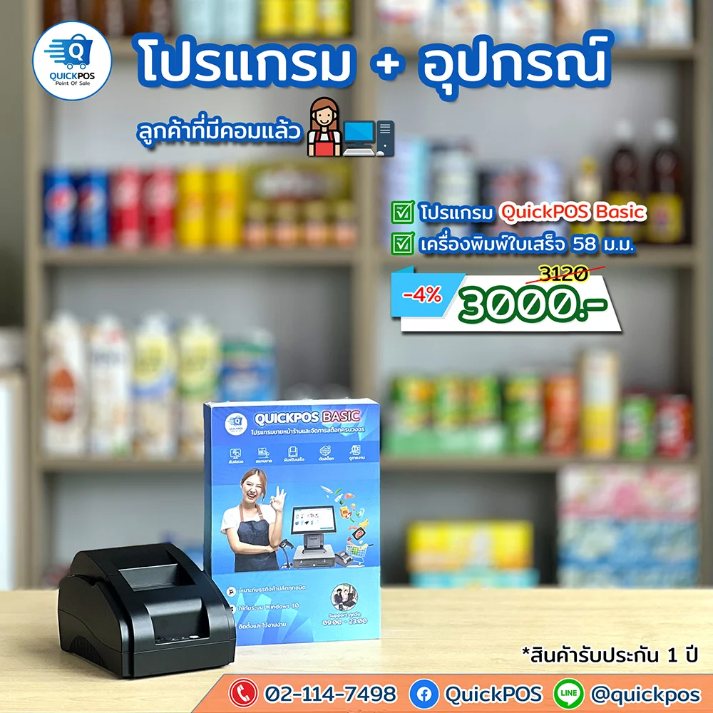 โปรแกรมร้านลองสด + เครื่องพิมพ์ 58 อุปกรณ์และเครื่องชั่ง