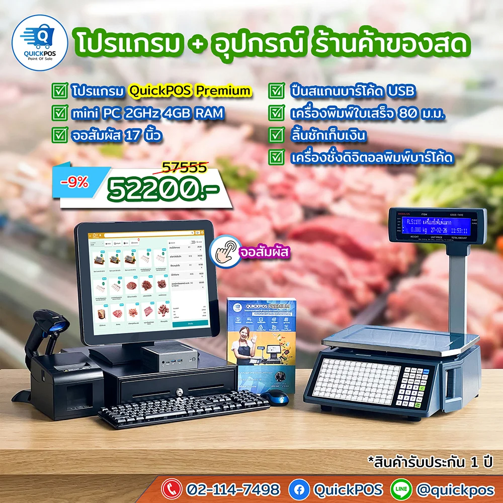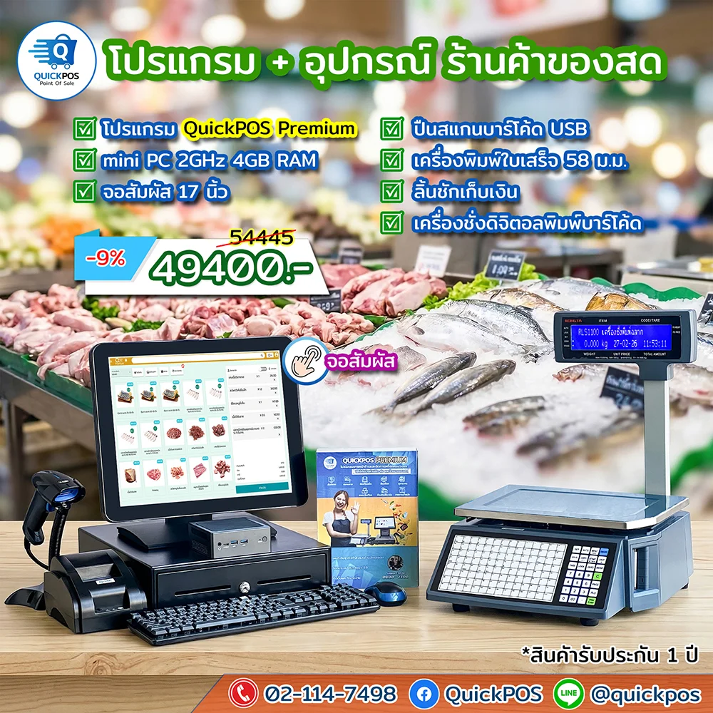 POS พร้อมใช้ ร้านของสด จอสัมผัส เครื่องพิมพ์ 80 เครื่องชั่ง
