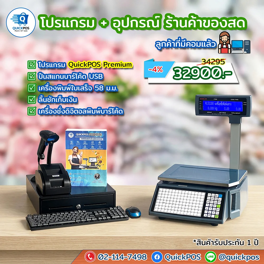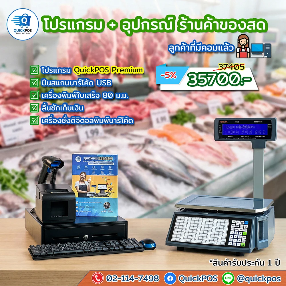 โปรแกรมร้านลองสด + เครื่องพิมพ์ 80 อุปกรณ์และเครื่องชั่ง