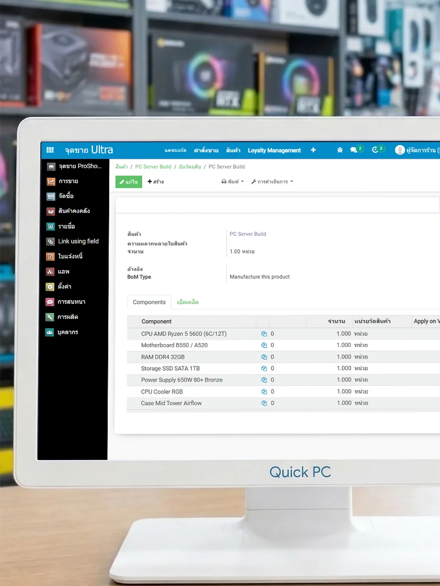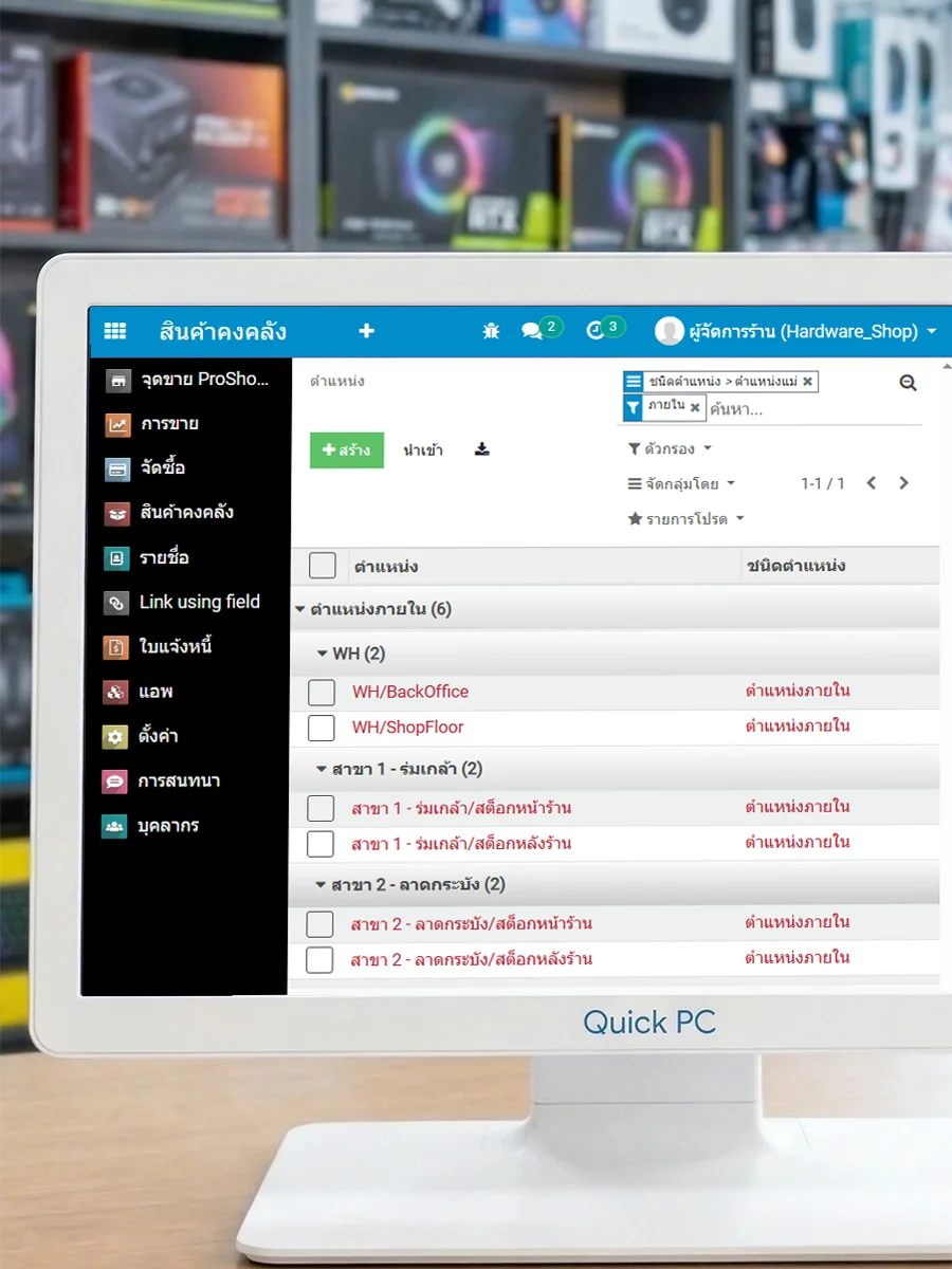 มีสต็อกหลายจุด เช่น สต็อกหน้าร้าน-หลังร้าน มีการโอนย้ายระหว่างกัน ทำการซื้อเข้า (PO) จากซัพพลายเออร์ มีการตรวจรับเข้าและนับสต็อกจำนวนมาก ต้องจัดการเลข serial ของสินค้าเพื่อรับประกัน มีการเบิก/คืนสินค้า หรือผูกองค์ประกอบสินค้า (BoM)